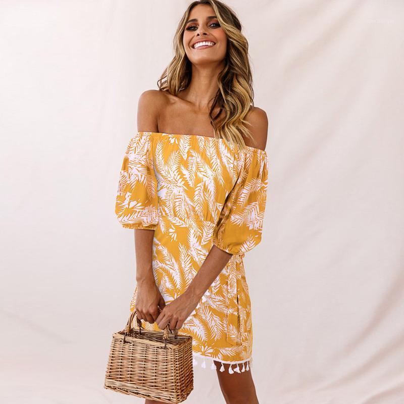 Summer vacation beach seaside dress Womens Sexy Off Shoulder Tassel Irregular Printing Lantern Sleeve Mini Dresses1