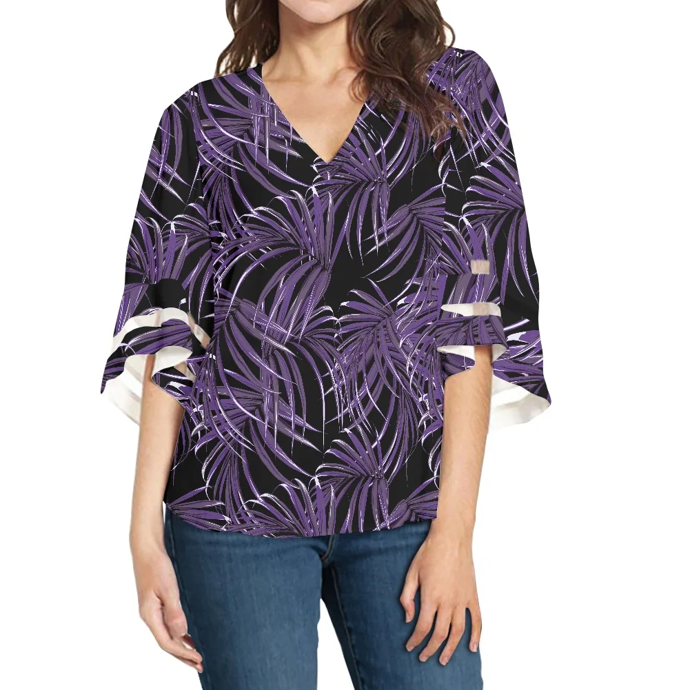 Прямая поставка от HYCOOL, гавайская вечерние топ с рукавами-колокольчиками и принтом пальмы, фиолетовые кружевные блузки, летние повседневные женские топы и блузки