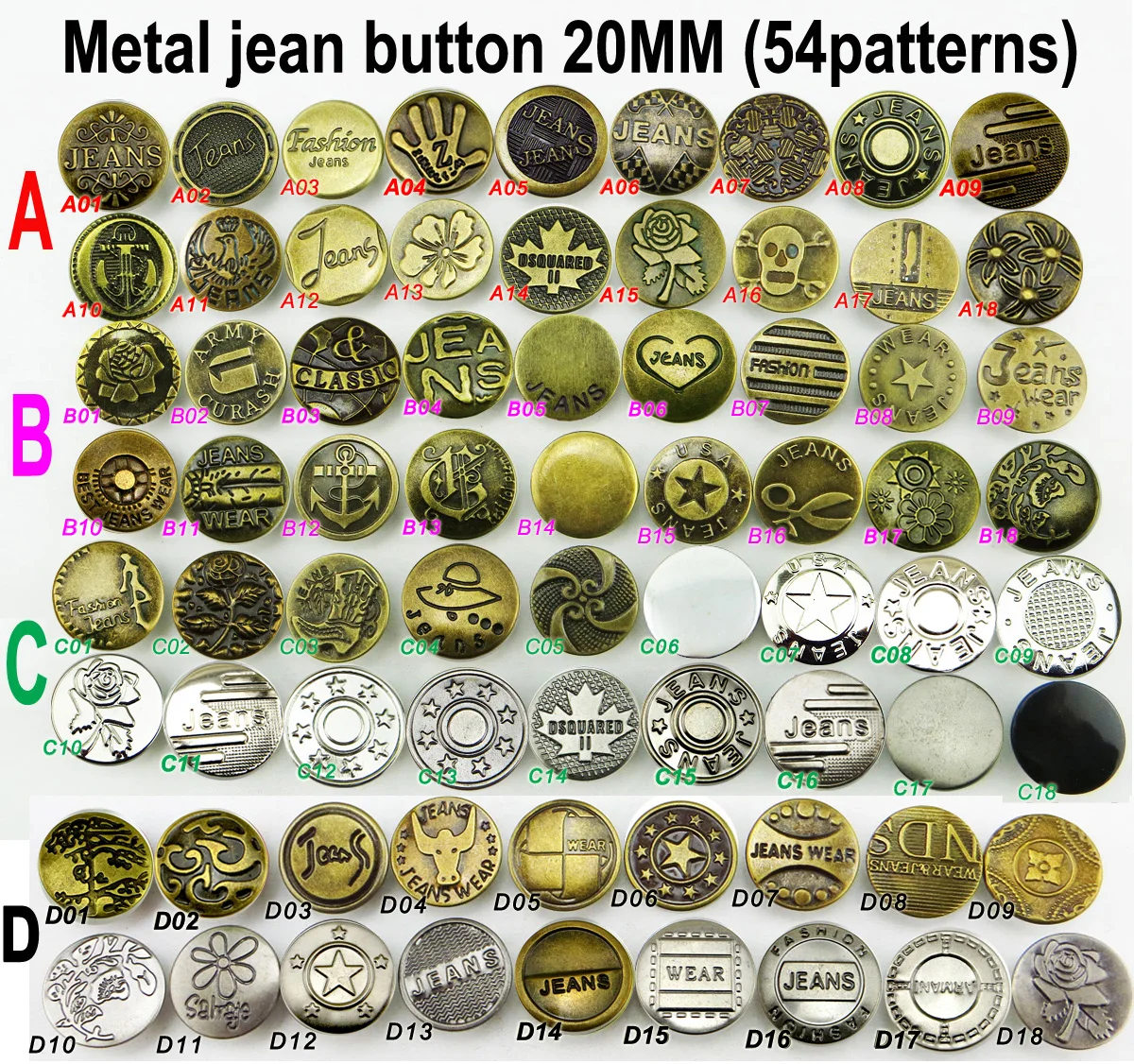 Пуговицы металлические для джинсов, 20 мм, 54 рисунка, 30 шт., JMB-186