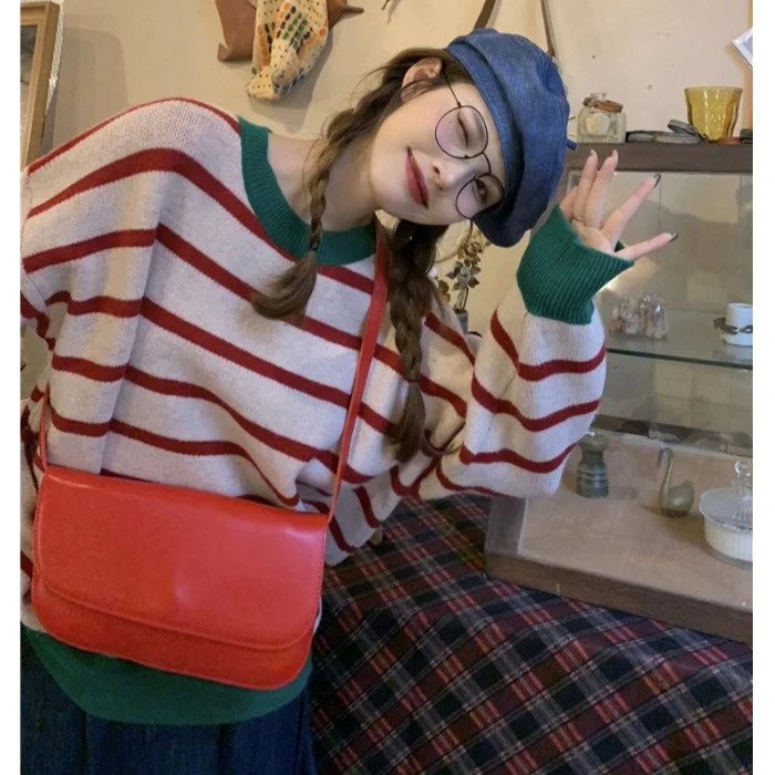 Пуловер женский в полоску контрастных цветов с длинным рукавом и воротником