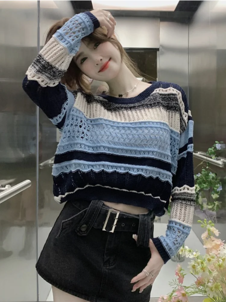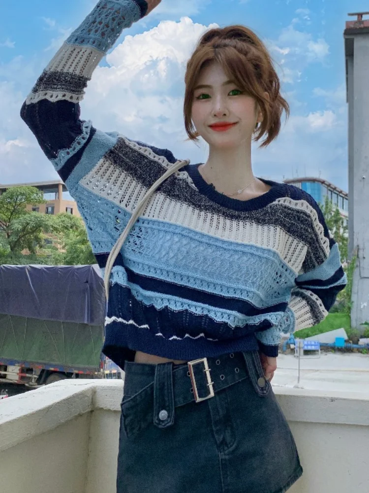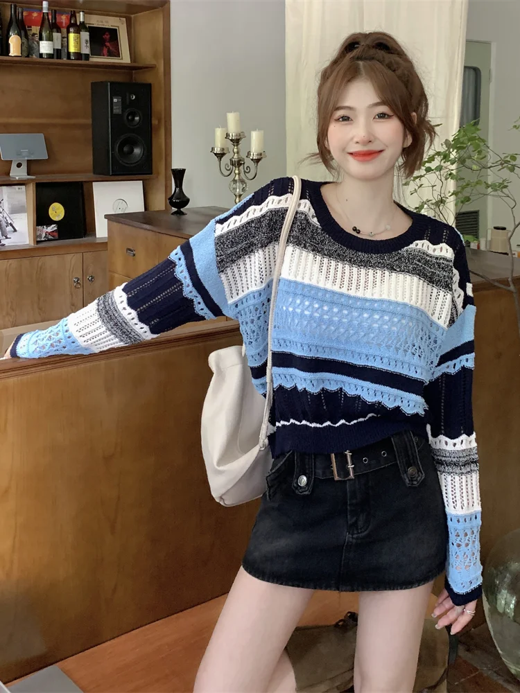 Пуловер женский трикотажный в полоску, с круглым вырезом