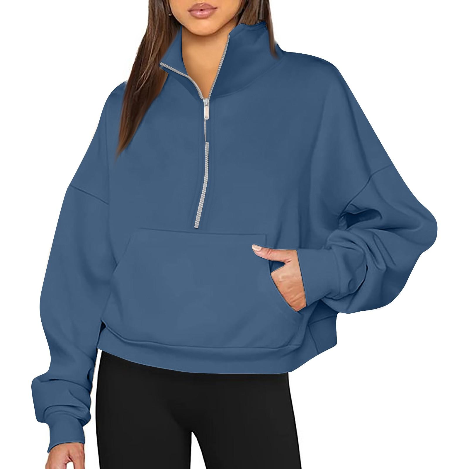 Пуловер на полумолнии, женские толстовки с капюшоном на четверти молнии, осенне-зимняя одежда, одежда с карманами, свободные кофты S синий