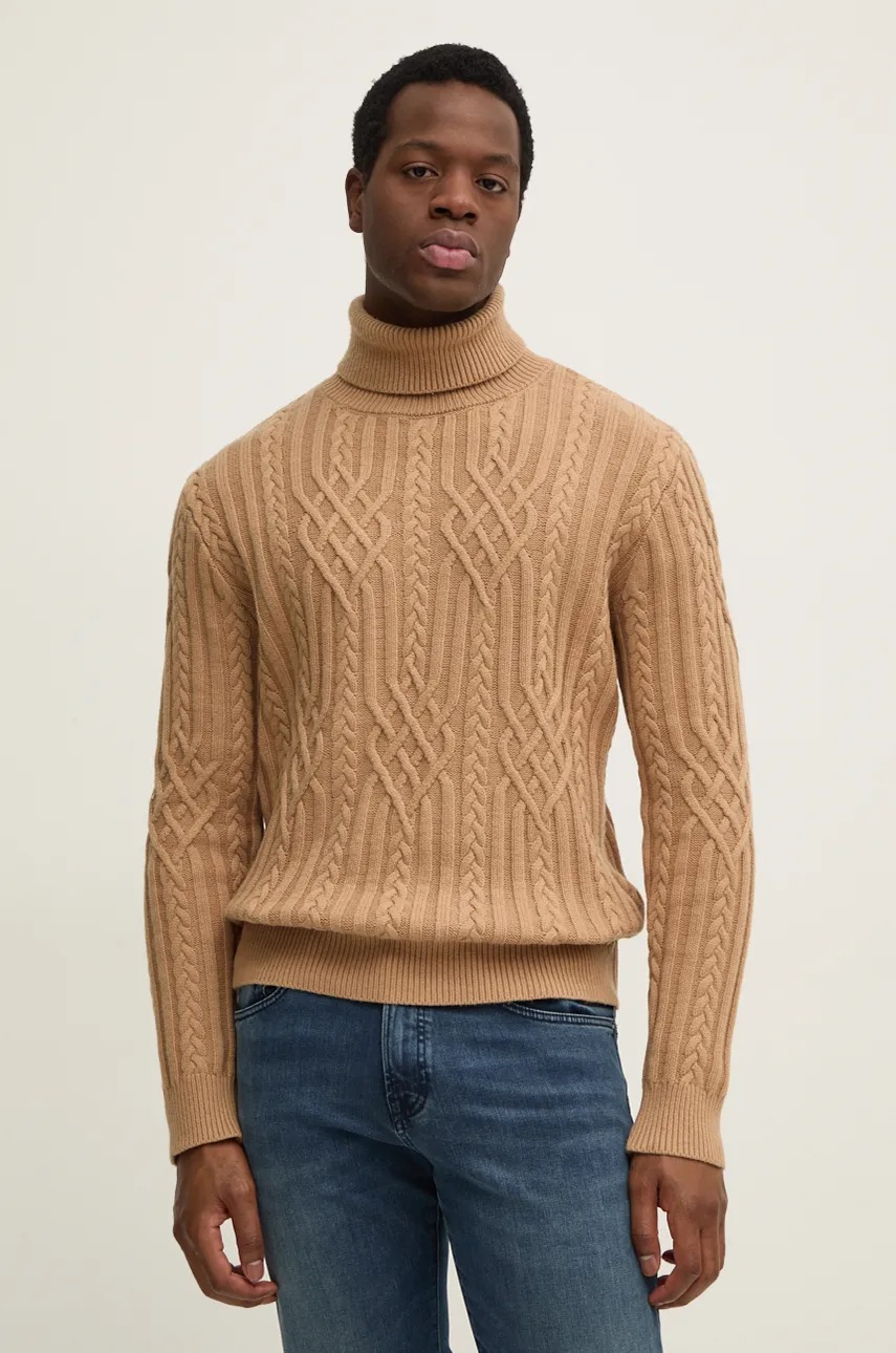 Пуловер Guess. Моделът е направен от еластичен трикотаж със средна плътност. Мека и приятна на допир материя.- Стандартна, неблокираща кройка.- Дълги ръкави.- Поло яка.- Еластични краища.- Красива плетка.- Дължина на ръкава: 68 cm.- Дължина: 72 cm.- Ширина под мишниците: 59 cm.- Мерките се отнасят за размер: M.