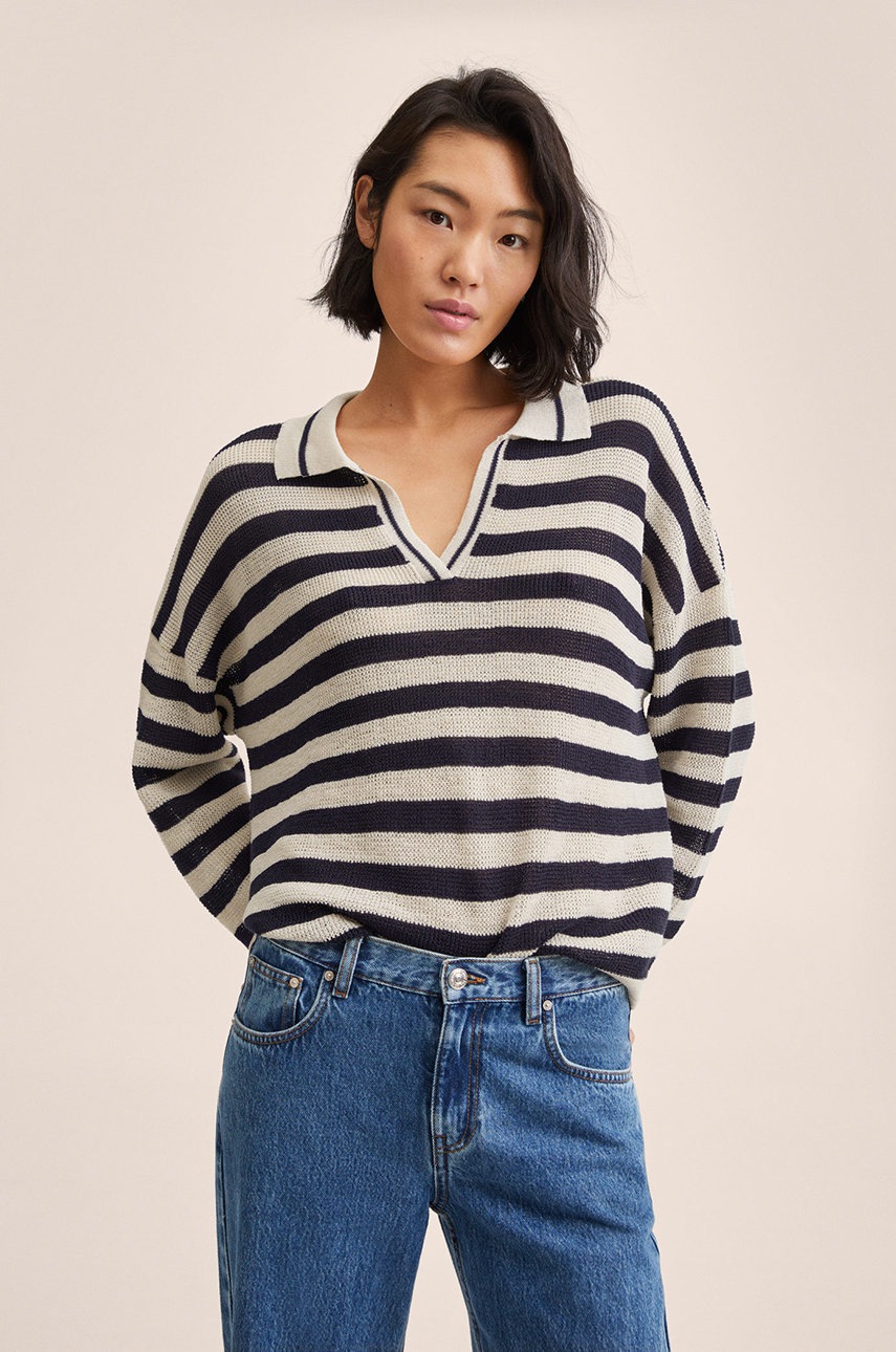 Пуловер от колекция Mango. Моделът е направен от трикотаж с шарки, с V-образно деколте.- Свободен модел.- Паднало рамо.- Яка.- Тънка и еластична материя.
