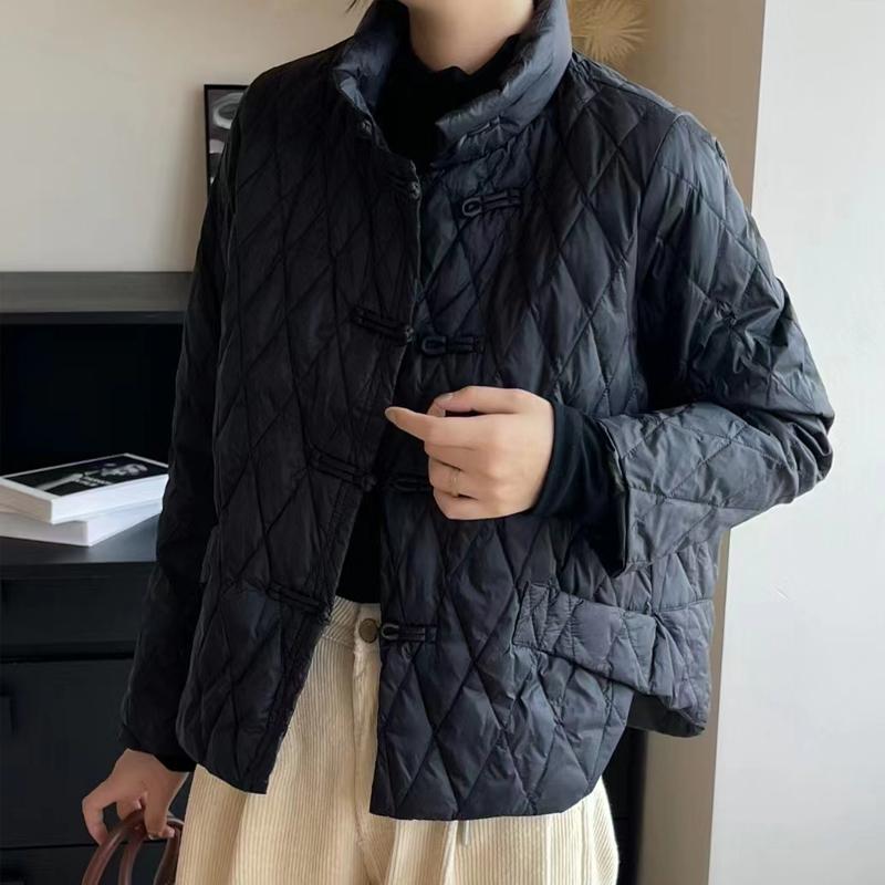 Пуховик женский с узором «ромбовидная сетка» короткий легкий зимний белый утиный пух M чёрный