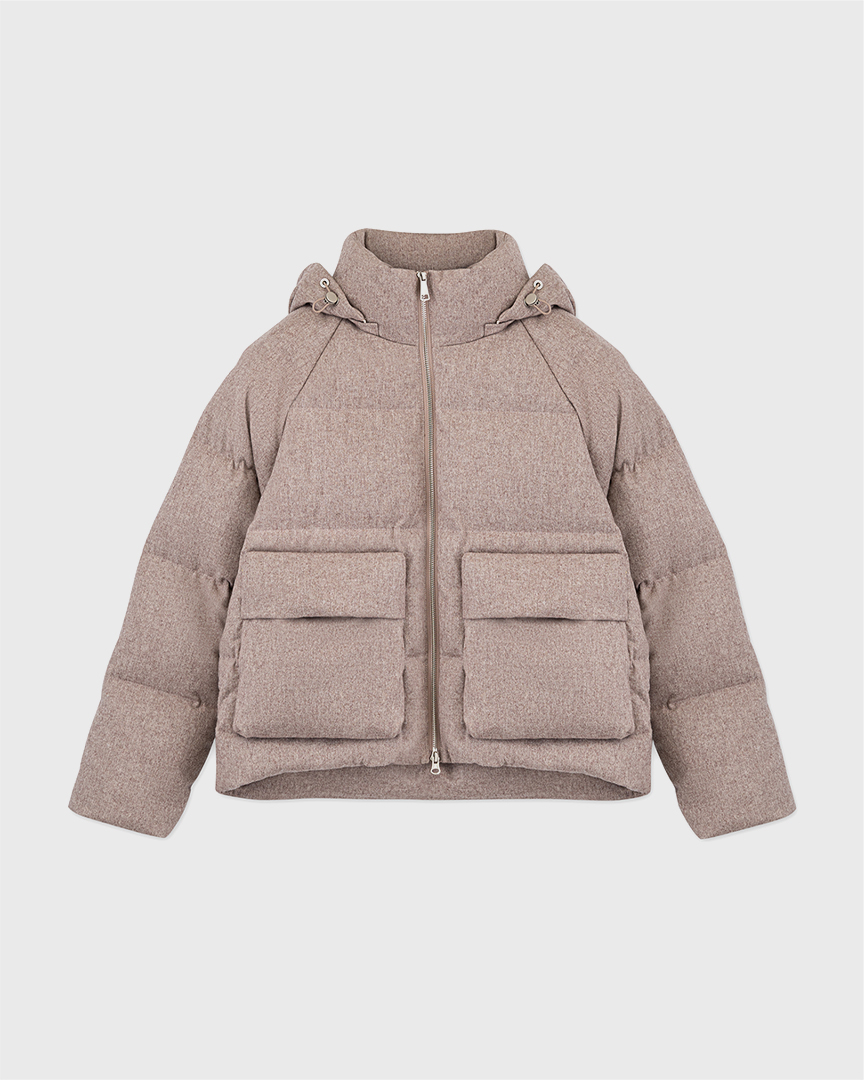 Пуховик из непромокаемой шерстяной пальтовой ткани с капюшоном, светло-коричневый