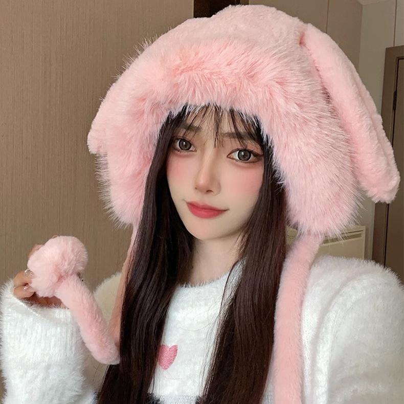 Пушистая шапка женская зимняя милая плюшевая модель с кроличьими ушками большая окружность головы утолщенная теплая вязаная шерстяная шапка-молния one size розовый