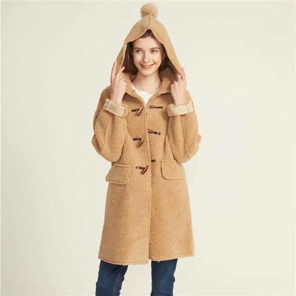 2020 new autumn and winter woolen coat women fashion solid color imitation lamb's wool suede hooded keep warm ladies cozy1, Black