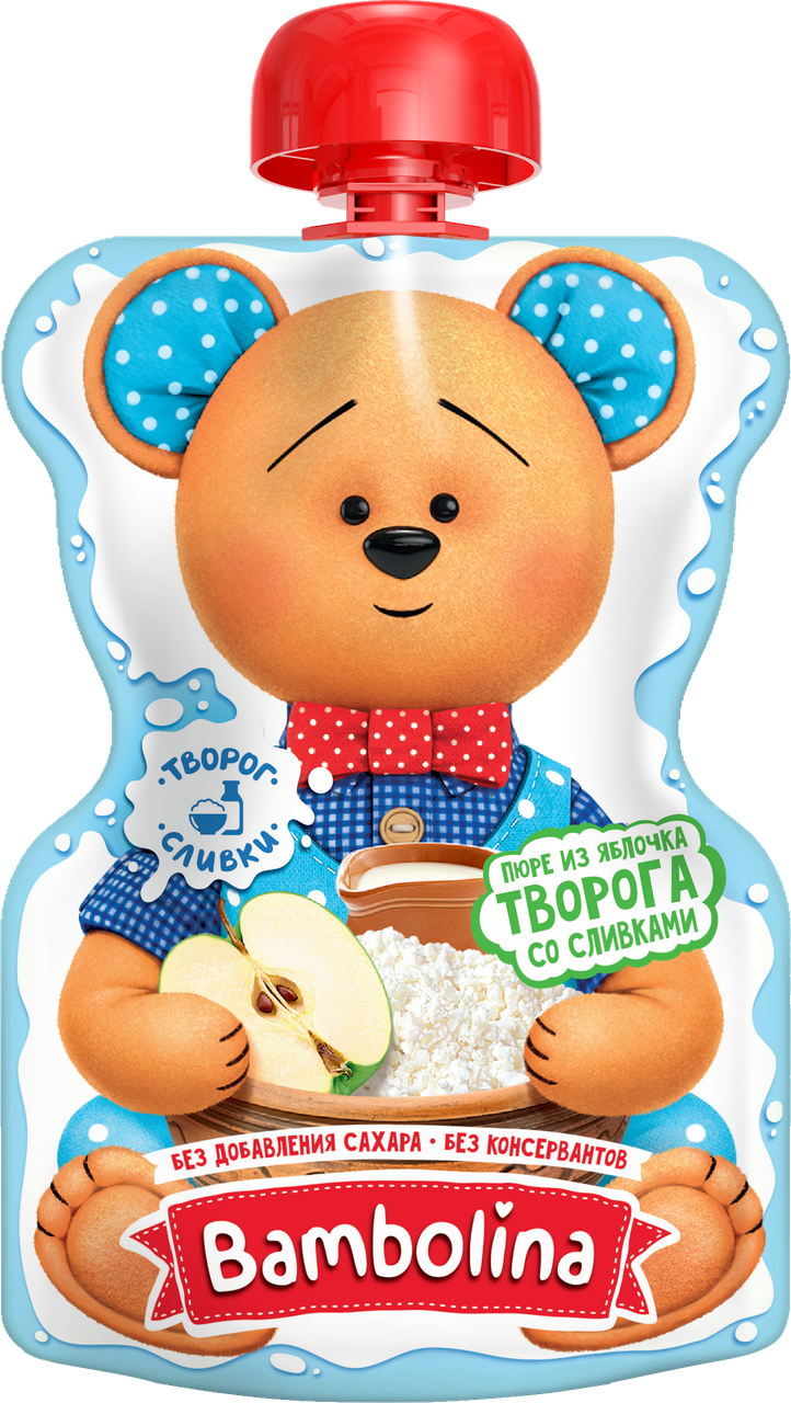 Пюре из яблоко, творога и сливок для детского питания Bambolina для детей раннего возраста с 6 месяцев. Питательный и полезный перекус для разнообразия рациона малыша. Творог — ключевой поставщик белка, кальция и фосфора в организм младенца.