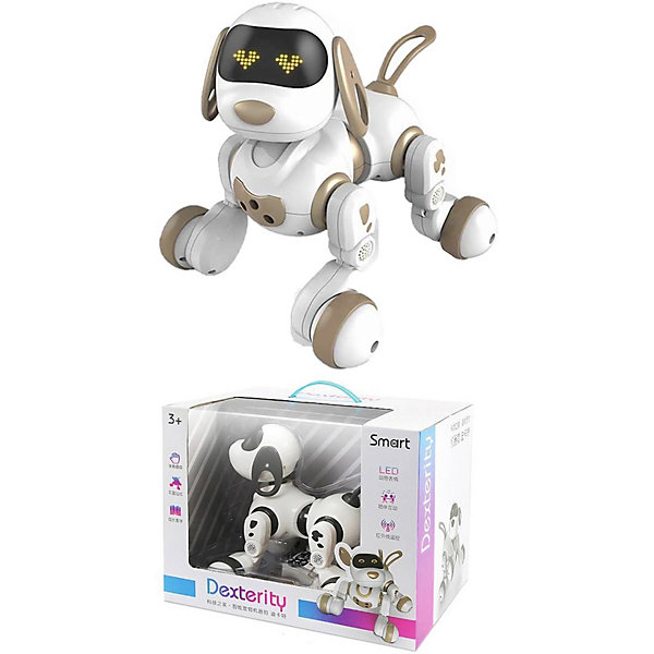 Радиоуправляемый робот выполнен в виде собаки. Он может выполнять различные команды, петь, танцевать. Также игрушка оснащена режимом обучения на английском языке. Робот-собака может выражать эмоции. Они будут отражаться в его глазах. Игрушка оснащена не только световыми, но и звуковыми эффектами. Для того, чтобы управлять ей, нужно использовать пульт.