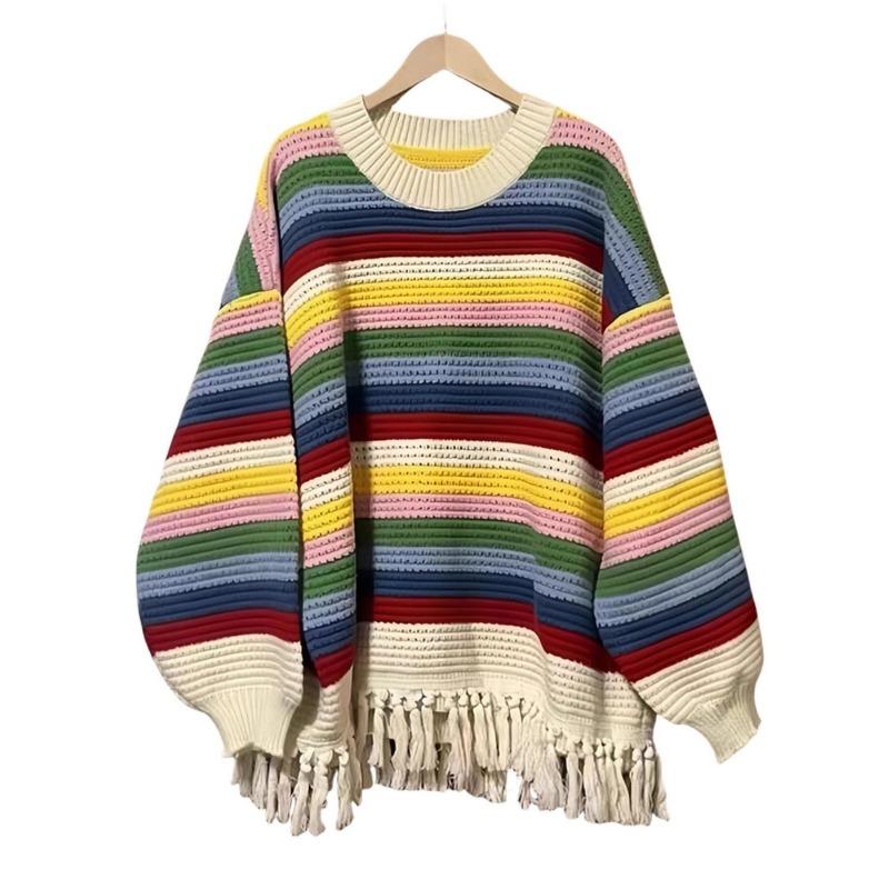 Радужный полосатый женский вязаный свитер с длинными рукавами и кисточками, шикарный женский топ на осень-зиму, свободная повседневная женская одежда One Size