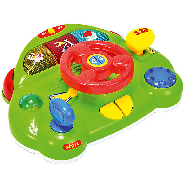 Поочередно нажимая на кнопочки, малыш услышит звуки автомобиля, сопровождающиеся световыми сигналами. В левой части игрушки есть погремушка, в правой - вращающееся колесо.