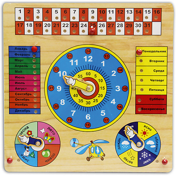 Календарь научит ребёнка ориентироваться в днях недели, месяцах и временах года. Малыш изучит их названия, сможет самостоятельно определить время по стрелкам на часах. Игрушка оформлена яркими рисунками. Развивает память, мелкую моторику, воображение и мышление.