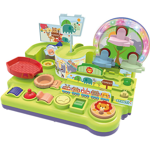 Игровой центр оснащён забавными звуковыми эффектами и красивой подсветкой. Содержит целых пять различных аттракционов. Небольшой квест разовьёт внимательность, координацию движений, ловкость и усидчивость. Также малыш будет проводить шарики через ступени, змейку с препятствиями, колесо обозрения, катапульту и платформу-качели. Для управления используются подвижные элементы, расположенные на панели.