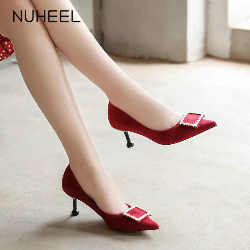 NUHEEL women's shoes French square buckle shallow mouth pointed high heels spring new elegant style fashion wild shoes women
