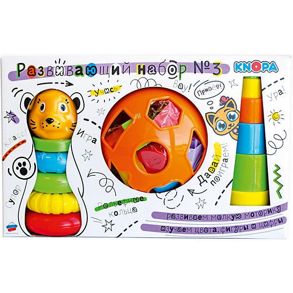 Набор включает пирамидку с рельефными кольцами, полусферу-сортер и пирамидку со стаканчиками-вкладышами. Он позволит ребенку научится определять разные материалы, узнать о понятиях больше-меньше, выше/ниже и других. Красочные игрушки выполнены из качественных материалов.