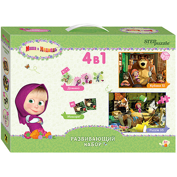 Развивающий набор 4в1 «Маша и Медведь» содержит 4 игры: кубики, пазл на 35 элементов, настольную игру мемори и домино.