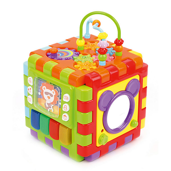 Развивающий мегакуб содержит увлекательные игры на каждой стороне. Имеется сортер, барабан, часы, лабиринт с бусинами, замок с ключом, шестерёнки и безопасное зеркало. Ещё его можно использовать как конструктор. Игровой центр дополнен музыкальной панелью с пианино. В него встроено 6 разных песен про животных, которые активируются нажатием на кнопки. При воспроизведении работают световые эффекты. Уровень громкости регулируется.