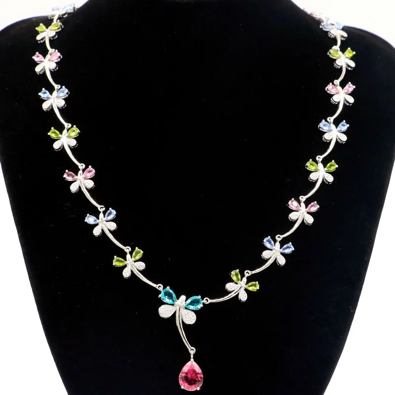 Разноцветная Стрекоза 34x17 мм, аквамарин, Зеленый Перидот, фиолетовый танзанит, женская повседневная одежда, свидание, серебряное ожерелье ...