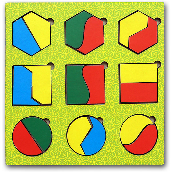• в комплекте: 1 панель с рамками-геометрическими фигурами, 3 круга, 3 квадрата, 3 шестиугольника (все фигуры разделены на 2 части)