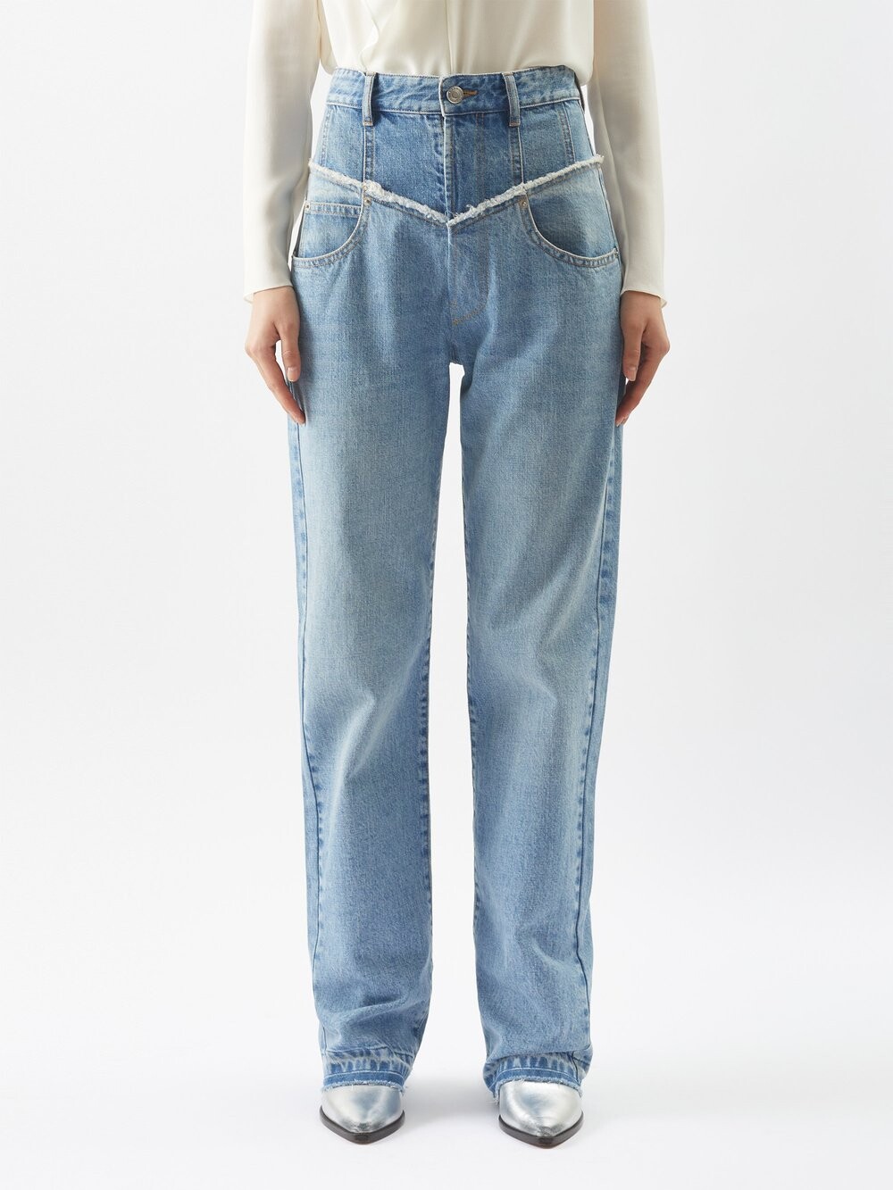 Необработанные края синих джинсов Noldy от Isabel Marant создают иллюзию двойного пояса, что было постоянным мотивом на показе мод бренда осень-зима 2023.