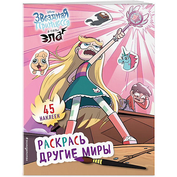 В раскраске «Раскрась другие миры» от «Эксмо» ребенка ждут герои мультфильма «Звездная принцесса и силы зла». Контурные картинки можно закрашивать фломастерами, красками, карандашами, а также украсить изображения 45 наклейками, включенными в книжку.