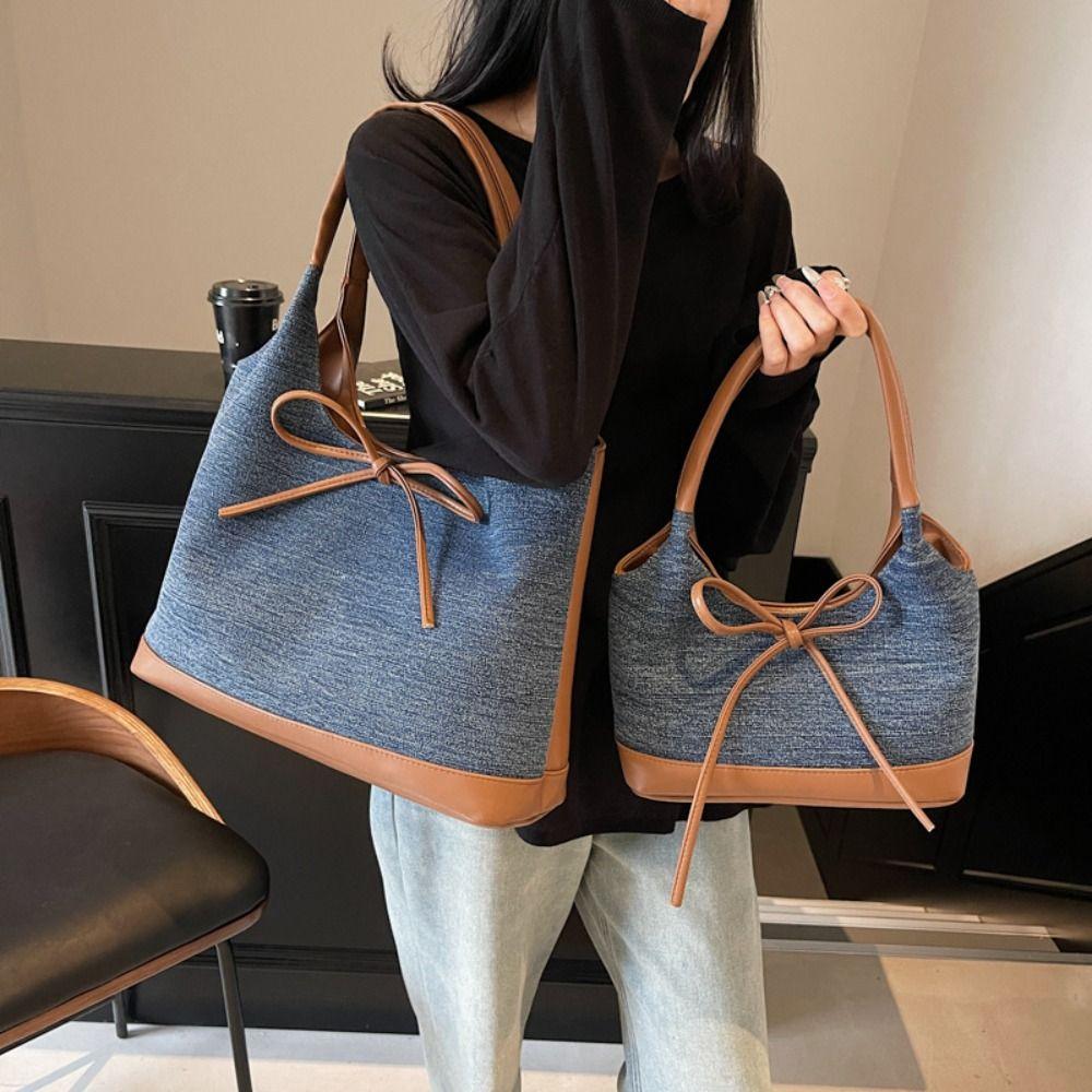 Korean Style Bow Tie Shoulder Bag Bowknot Canvas Tote Bag Fashion Retro Underarm Bag Lady Light Blue-Small