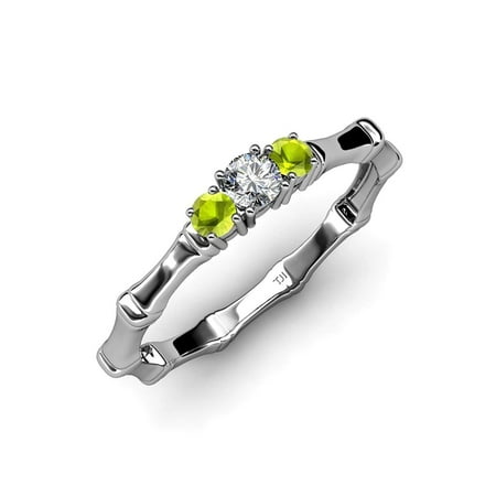 Peridot with Center Diamond (SI2-I1 G-H) Three Stone Bamboo Ring 0.32 ct tw in 14K White Gold.size 6.0