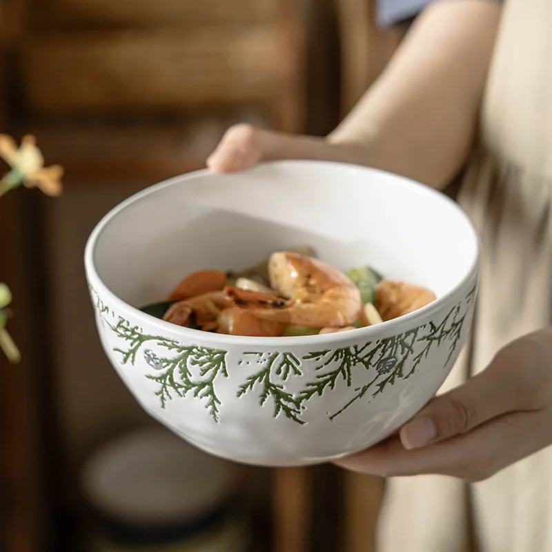 Рельефная салатница с зелеными листьями, керамическая чаша, круглая посуда в стиле ретро для домашнего ресторана