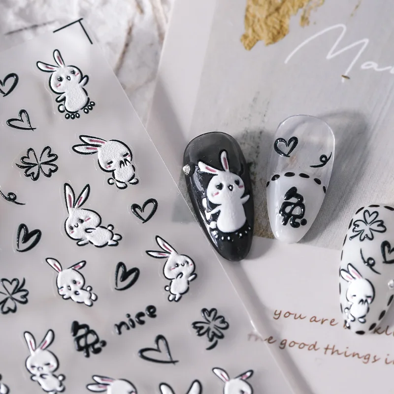 Рельефы самоклеящиеся для ногтей, мягкие рельефные 3D наклейки с белым, черным мультяшным Кроликом, котом, сердцем, 5D, симпатичные, для нейл-арта