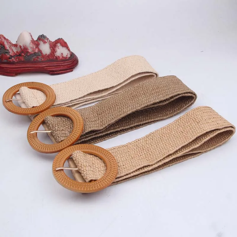 Ремень женский Плетеный с деревянной пряжкой, винтажный широкий пояс в богемном стиле, эластичная подкладка из льна с круглой пряжкой, KT47, л...
