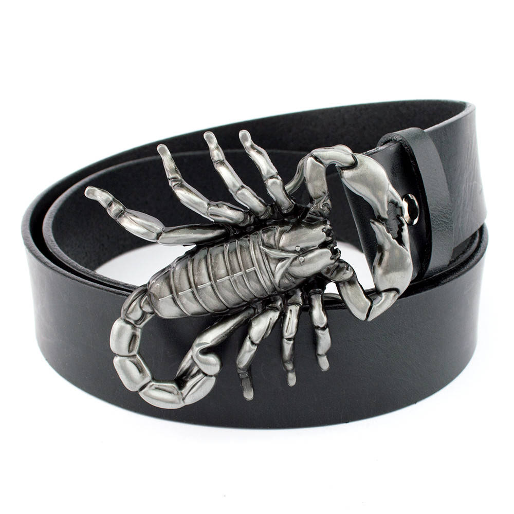 Такой ремень точно привлечет к себе внимание любителей необычного и брутального стиля, ремень качественный и уникальный в своей категории, гармонично сочетается с джинсами и другими свободными нарядами. Полотно данного аксессуара состоит из натуральной цельной кожи и окрашено в черный цвет. Основная изюминка этого ремня в стильной необычной пряжке в форме скорпиона и привлекает внимание своим необычным видом.