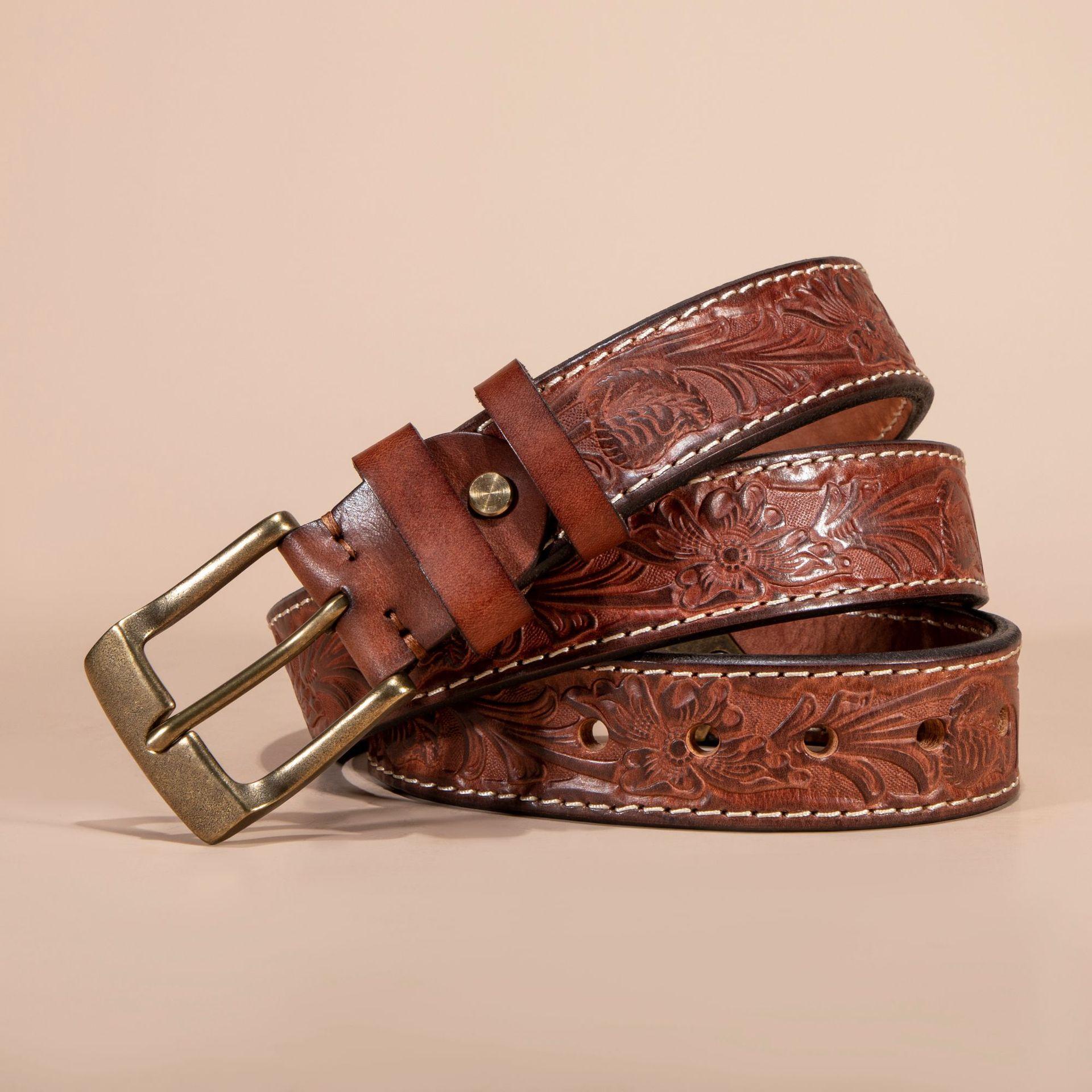 Ремень с тиснением в стиле ретро для мужчин из натуральной кожи с медной пряжкой, первый слой из коровьей кожи 110cm-130cm тёмно-рыжий