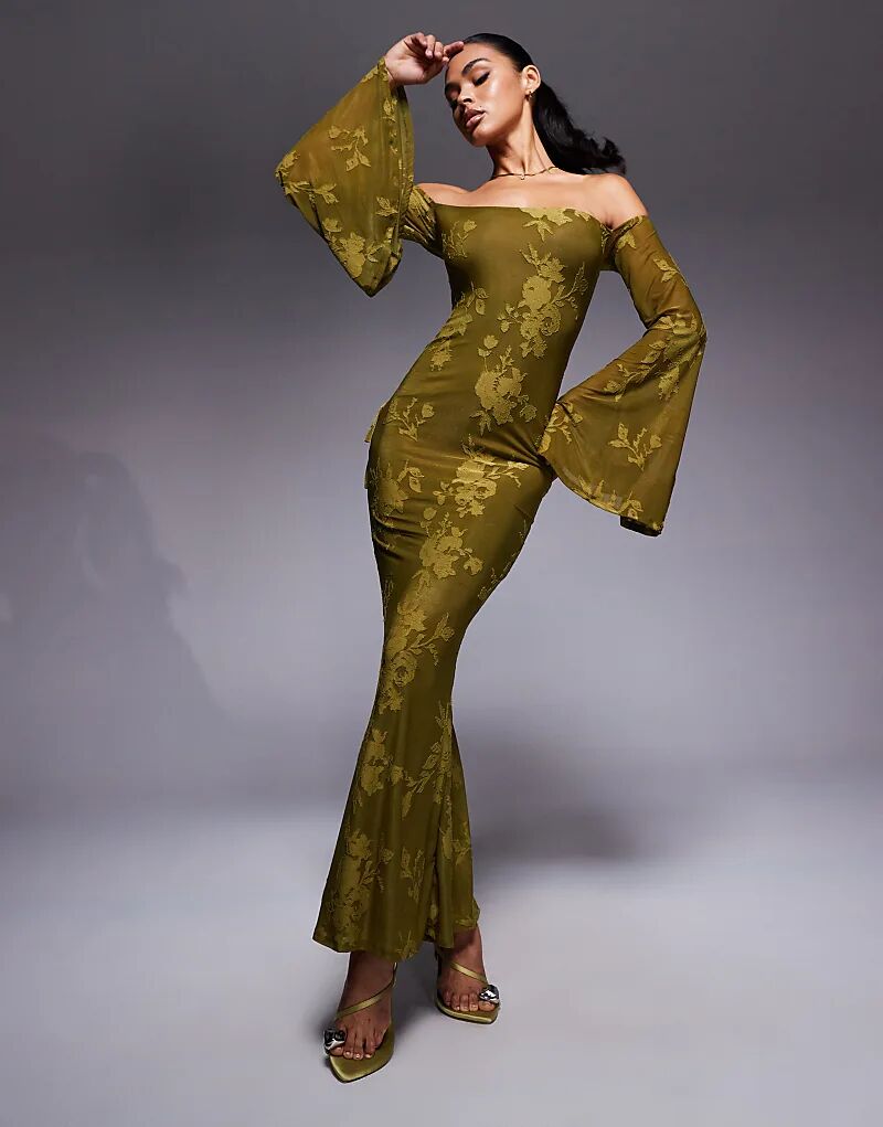 Платье макси ASOS DESIGN с открытыми плечами, объемными рукавами-ангелами и бантом на спине оливково-зеленого цвета