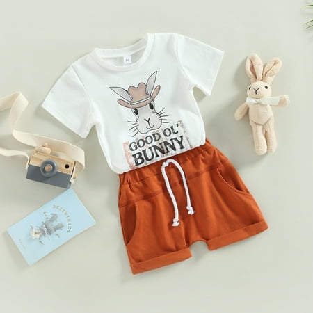 Lamuusaa 2Pcs Easter Bunny Summer Shorts Set for Baby Boys Short Sleeve T-shirt with Elastic Waist Shorts Outfit