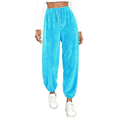 Tiqkatyck Fuzzy Pajama Pants Women s Thick Pants Elastic Solid Color Plush Thermal Full Length Loose Comforting Warm Winter Capris Leggings Casual Pants for Women Blue