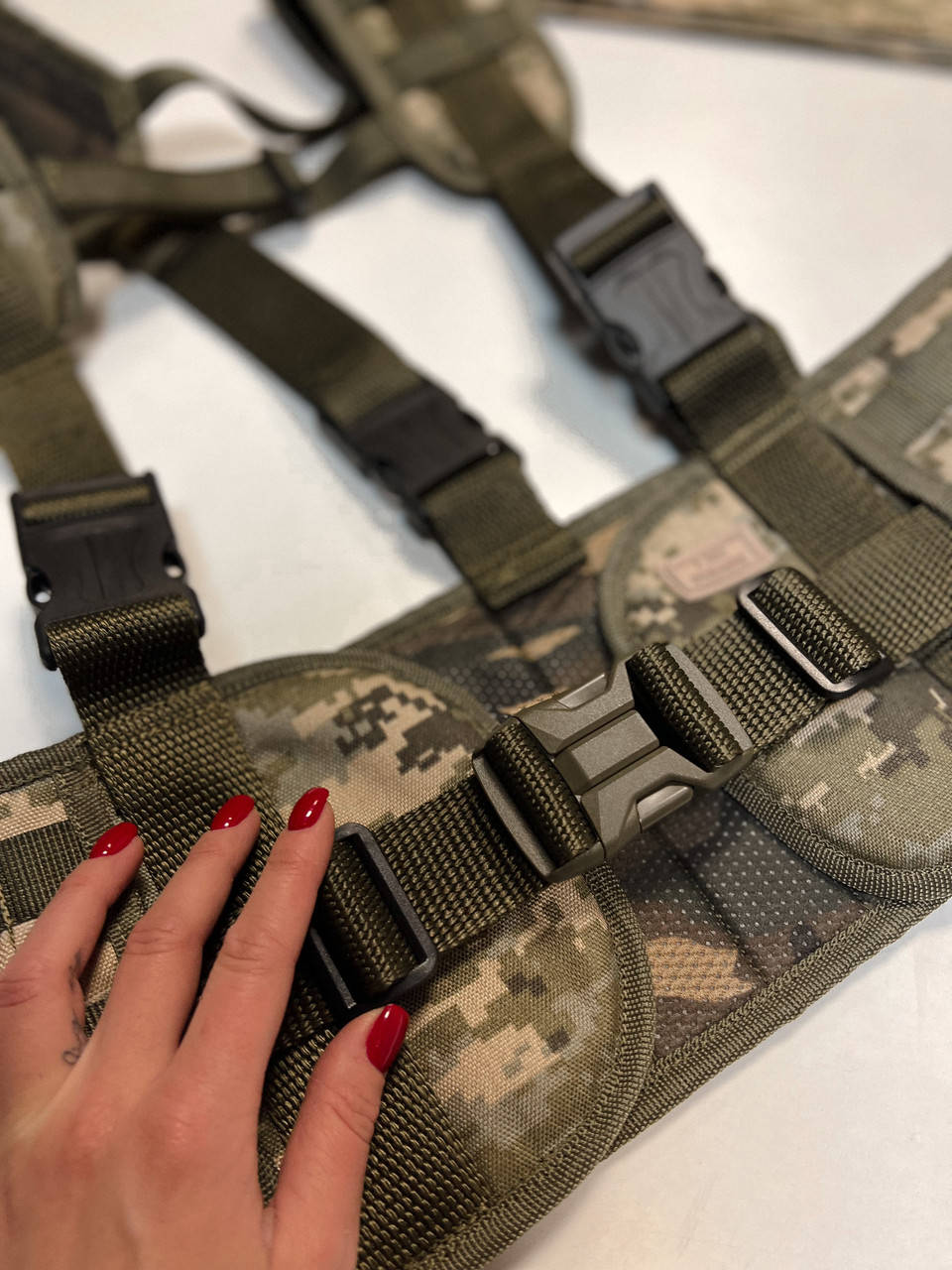 Пояс тактичний з підтяжками на системі MOLLE, який фіксується на поясі за допомогою фастексу. Пояс регулюється по ширині за допомогою перетяжок.