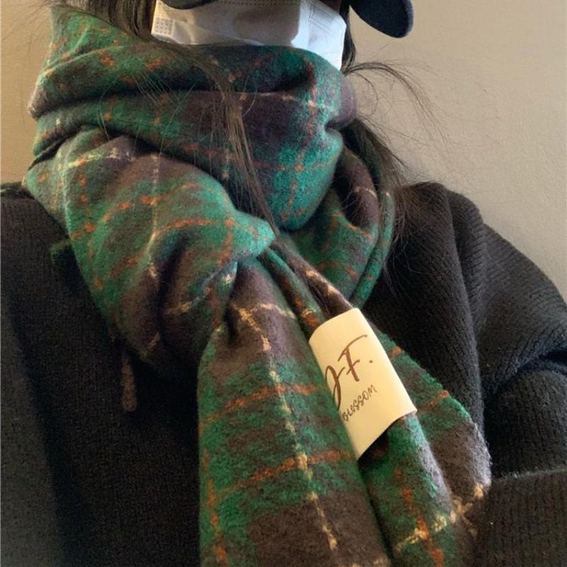 Ретро Зеленый Плед Корейский Стиль Шарф Зимний Теплый Студенческий Универсальный Утолщенный Платок Грелка для Шеи One Size