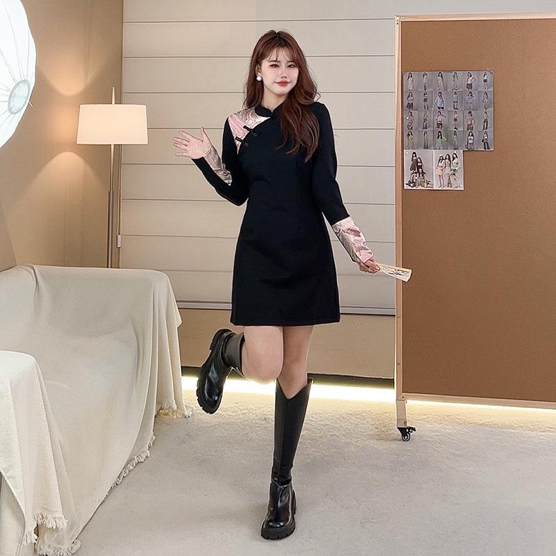 Ретро Зимнее и Осеннее Приталенное Платье Ципао Большого Размера для Женщин 3XL for 150-165 jin чёрный