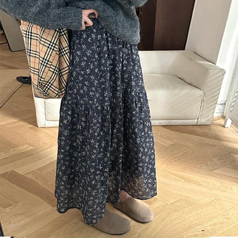 Ретро Цветочная Юбка для Женщин Весной и Летом Новая Маленькая А-силуэта Юбка-зонт Шифоновая С высокой талией Юбка-торт M темно-синий