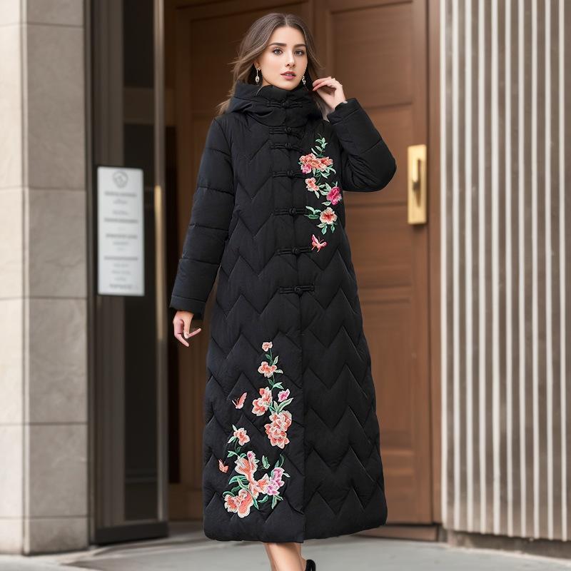Ретро-куртка с хлопковой подкладкой Длинная, до колен, хлопковая подкладочная одежда Женская хлопковая подкладочная одежда Пряжка XXL [Recommended 135-75kg] чёрный