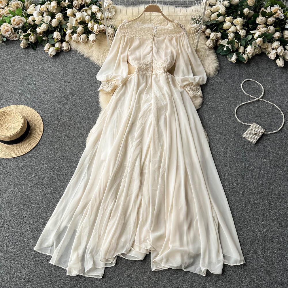 Ретро платье макси с разрезом вырезом и длинными рукавами-фонариками, кружевное лоскутное платье на молнии, однотонное женское элегантное винтажное платье для пожилых людей One Size абрикосовый
