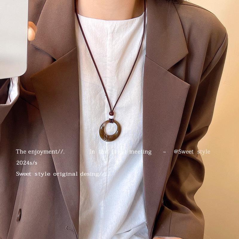 Ретро этническое кремовое круглое ожерелье из смолы с длинной цепочкой с кисточками X1631 кофейный