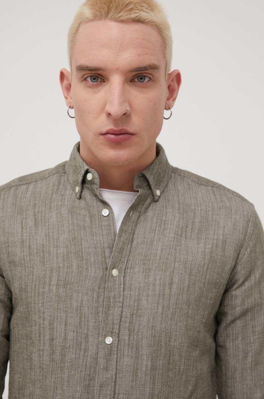 Риза с лен Only & Sons мъжка в зелено с кройка по тялото с яка с копче, Зелен