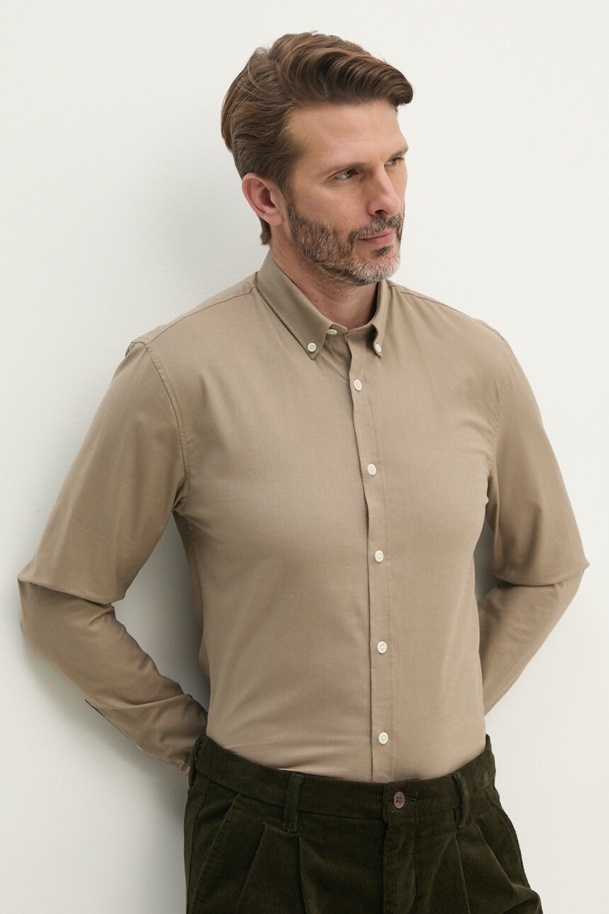 Риза Lindbergh мъжка в бежово със стандартна кройка с яка с копче 30-203174, Бежов