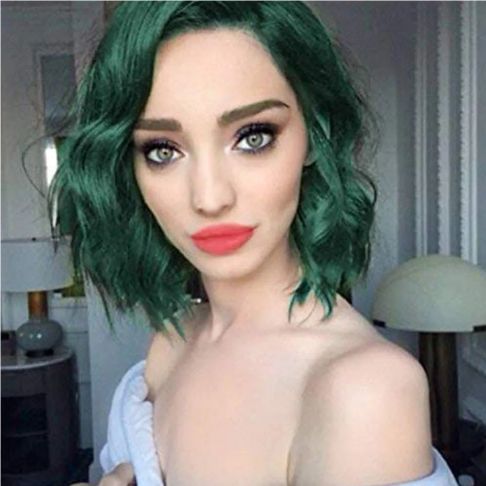 Imeya 12" Short Wavy Bob Wig Green Hair Color Cosplay Synthetic Lace Front Wig Heat Resitant Fiber Party Wigs For Women