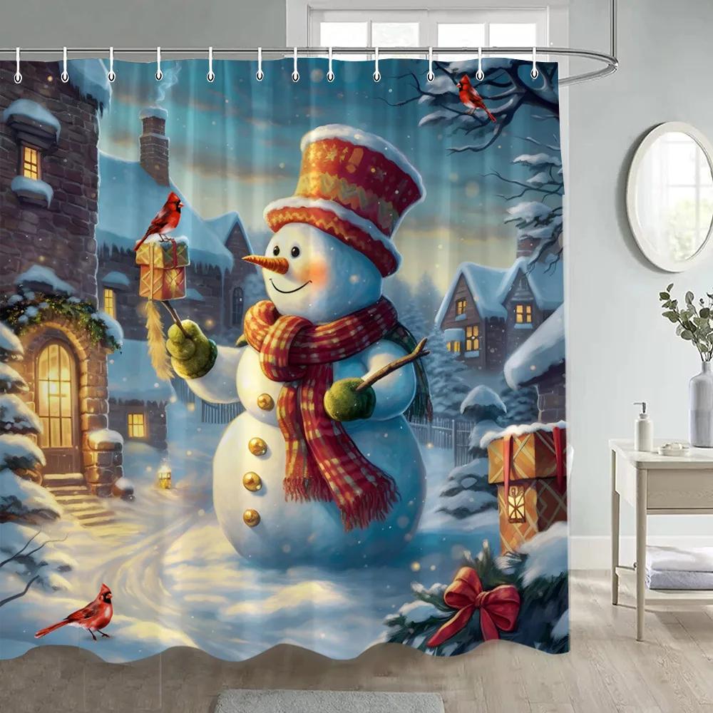 Рождественский Снеговик Душевая Занавеска Зимний Лес Красные Ягоды Птицы Снежная Сцена Рождественские Шторы Для Ванной Ткани Настенный Декор Для Ванной Комнаты 90x180cm-35x70in