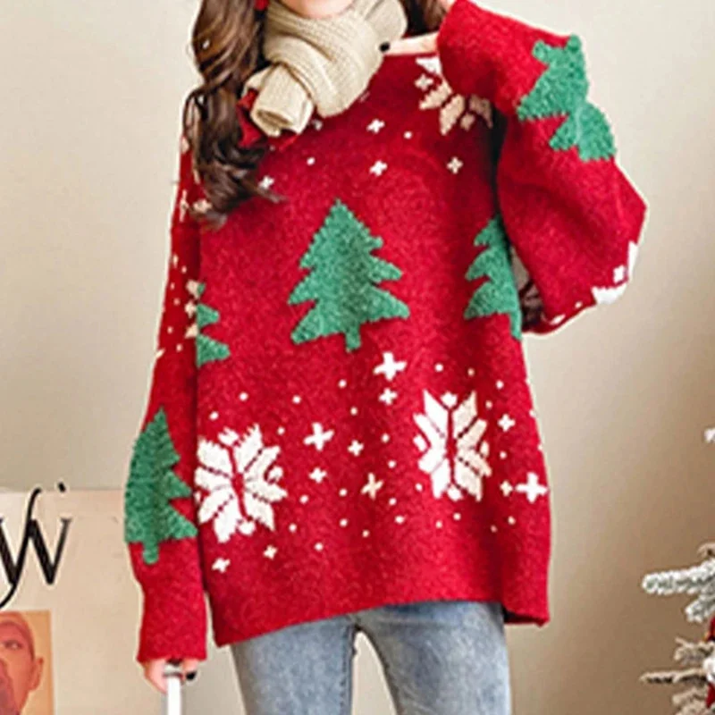 Рождественский красный женский свитер, осенний зимний вязаный пуловер, Свободный корейский модный теплый вязаный Повседневный рождественский джемпер с длинным рукавом