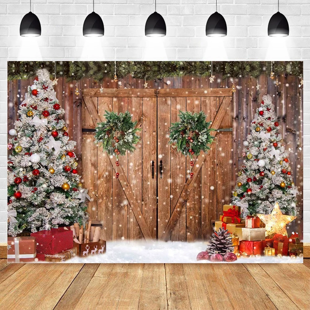 Рождественский фон Рождественская елка цветок кольцо подарок Фотофон реквизит деревянная дверь фотография Фон дети семейный портрет Фотостудия