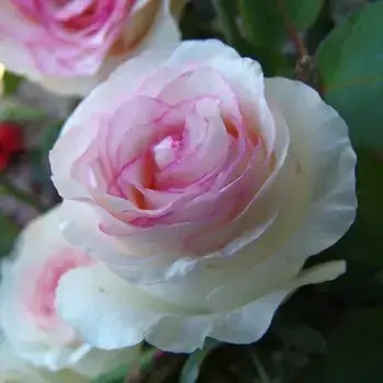 Бокаловидные цветки из 17-25 лепестков двухцветной окраски: белый с широкой темно красной каймой. Листва темно-зеленая, глянцевая, куст практически без шипов. Аромат слабый.